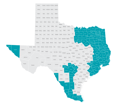Molina Medicare Complete Care (HMO D-SNP): Anderson, Angelina, Atascosa, Austin, Bandera, Bowie, Brazoria, Cameron, Camp, Cass, Chambers, Cherokee, Collin, Comal, Cooke, Delta, Denton, Duval, Ellis, Fannin, Fort Bend, Franklin, Galveston, Grayson, Gregg, Guadalupe, Hardin, Harrison, Henderson, Hood, Hopkins, Houston, Hudspeth, Hunt, Jasper, Jefferson, Jim Hogg, Johnson, Kaufman, Kendall, Lamar, Liberty, Marion, Matagorda, Maverick, McMullen, Medina, Montague, Montgomery, Morris, Nacogdoches, Navarro, Newton, Orange, Panola, Parker, Polk, Rains, Red River, Rockwall, Rusk, Sabine, San Augustine, San Jacinto, Shelby, Smith, Starr, Tarrant, Titus, Trinity, Tyler, Upshur, Van Zandt, Walker, Waller, Webb, Wharton, Willacy, Wilson, Wise, Wood, Zapata counties