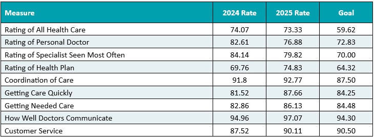 The CAHPS reporting year is the year after the data was collected. For example, “2024 Rate” includes data from January to December 2023 and “2025 Rate” includes data from January to December 2024.