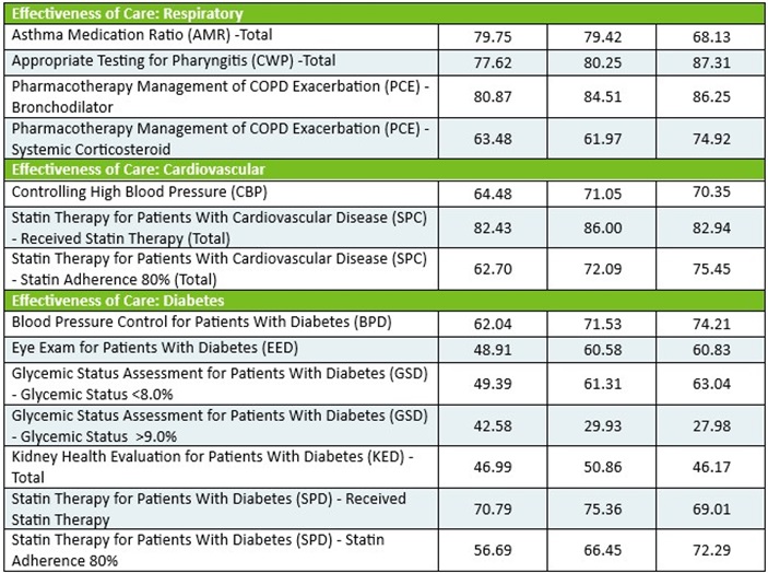 Molina’s scores for the past two years are below. You can see how Molina performs compared to the NCQA 66.67th percentile Quality Compass Benchmark.