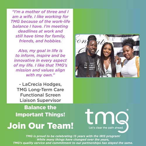TMG prioritizes a good work/life balance. TMG is growing and offers a variety of challenging and unique remote positions throughout the State of Wisconsin. Employees work from their home office and travel throughout their assigned area to support individuals in Wisconsin’s self-directed long-term care program called IRIS.